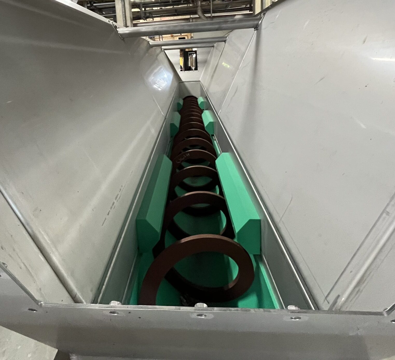 The shaftless screw conveyor is used for conveying difficult flowing, sticky or fibrous bulk materials. The solid screw flight rotates without a central pipe in a wear resistant trough. This prevents material build up or wrapping.