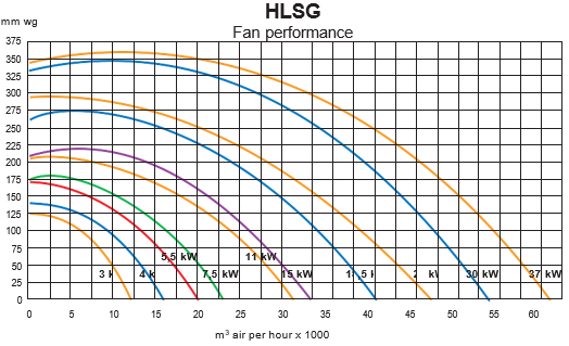 Prestatiegrafiek van de TLR ventilator met drukcurves (mm wg) ten opzichte van luchtdebiet (m³/h), per kW-klasse