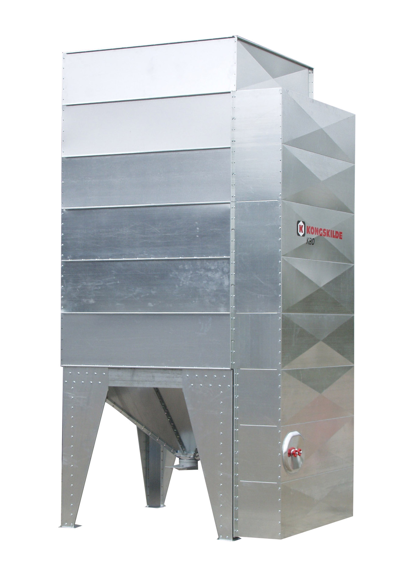 Batch dryers are efficient and cheap in use. Compactly build. They give a good performance at a low investment. Triangle shaped ducts divide the drying air into the grain column. The dryer is made of galvanized steel. The outlet hopper also has drying ducts, so this space is also being used for drying. The outlet has a manual shutter.