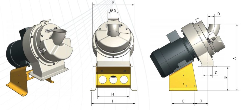 Disc mill with adjustable grinding gap. Image shows technical dimensions and inlet/outlet configuration.